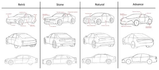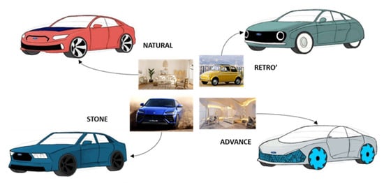 For the presented case study, the trends can be classified according to four main stylistic trends from the last few years: Retro, Natural, Stone, and Advanced (Figure 4). The four stylistic trends are generally separate and distinguishable in different product designs, but they can also be mixed to create a completely new style that combines the past, the present, and the future of car design. The proposed model aims to be innovative both for characteristics and style.