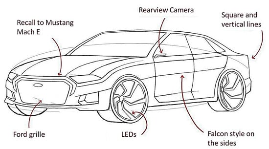 This study was intended to describe the stylistic development of an electric, futuristic, and highly innovative sedan. Starting from a preliminary analysis (QFD), the characteristics and requests of customers for the vehicles of the E segment were analyzed. These requirements were studied by considering the present and the near future mobility in urban and extra-urban traffic. This work presented a study on current stylistic trends and on stylistic procedures adopted in the US brand Ford, describing the external styling of some models.