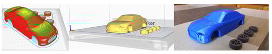 Furthermore, because of the growing diffusion of rapid prototyping, many technologies are now available for designers, 3D printing in particular. The most widespread 3D printing technology is FDM—Fused Deposition Modelling— where the object is built using the extrusion of a molten thermoplastic polymer. In this case study, the first result of the SDE method was printed through additive manufacturing, using FDM technology in particular. The Ford Eagle 3D printing model is simplified in the number of surfaces that can be made and the complexity of the mesh in order to facilitate the printing process of an scaled model (Figure 9). The geometry of various elements is modified, including the details of the front bezels, the joints of the doors and windows, and the air intake slots, which are reduced to small extrusions with parallel walls, and flat bottom, making the model suitable for printing with FDM technology. The shell was separated from the wheels. The simplified model of the car, in STL format, was imported into the Ultimaker Cura software, where the slicing process was assessed, and the deposition phase started.