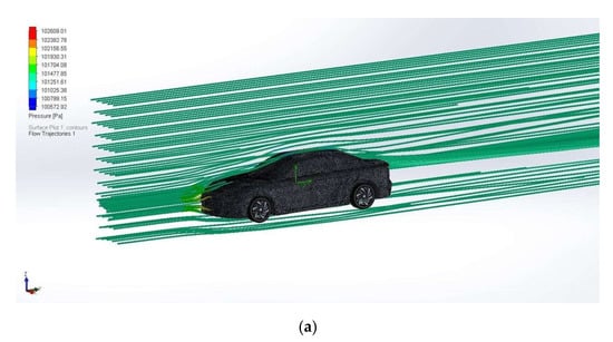 Additionally, after revising the front geometry, a Cd equal to 0.23 was obtained, which is compatible with benchmark sedans. Table 5 shows that the coefficient that was found is inside the average values of the coefficients considered for this paper. By comparison, Figure 15 shows that the last coefficient calculated is inside the average values of the model’s coefficients considered for this paper.