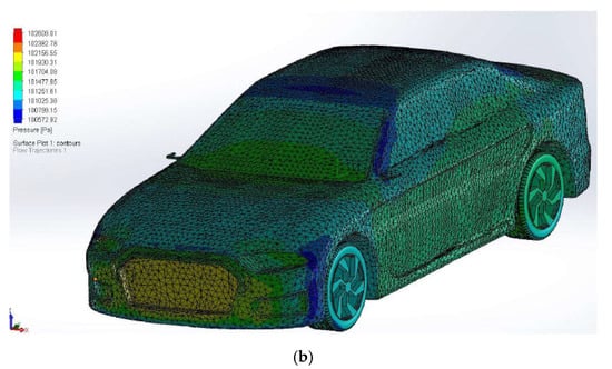 A Flow simulation was performed afterwards using Fd as the aerodynamic drag force calculated using SolidWorks, an air density equal to 1.225 kg/m3, the applied velocity equal to 36 m/s, and a front section area of the vehicle equal to 2.3 m2. Flow simulation is set up as an external flow analysis, where the body is immersed in the fluid flow. The car is considered at a highway velocity limit of 130 km/h, equal to 36 m/s, in the Y direction (Figure 13).