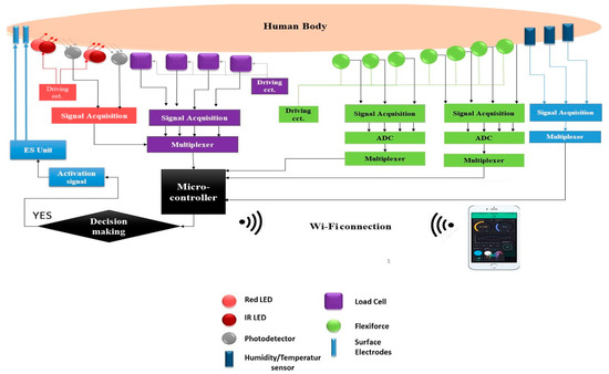 Proposed system block diagram showing the sensors’ attachment to the human body and Wi-Fi communication with the user interface and ES unit.