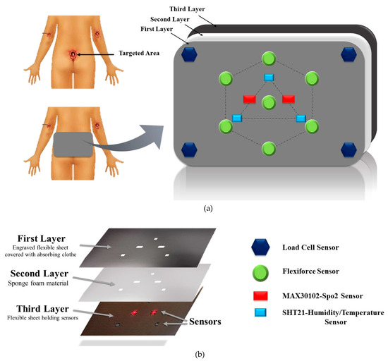 (a) Shape and location of the ulcer-sensing device over the targeted area. (b) Design of the ulcer-sensing pad.