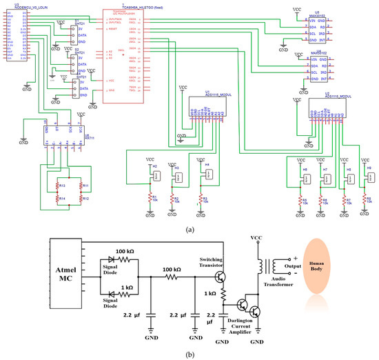 (a) Schematic of all sensors used and their interface with the main microcontroller. (b) Schematic of the ES unit and its interface with the human body.