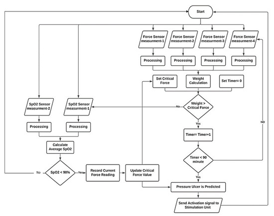 - Decision-making of PU prediction is a multi-step algorithm built based on the physiological process that leads to PU formation. The main indicator of PU is saturation of oxygen in blood (SpO2); oxygen drops due to the force applied on the area causing the collapse of blood vessels, this force is basically a portion of the subject’s weight applied to the sacral region; many researchers assumed different levels of critical force that leads to PU formation [28]. These values are set as “initial critical force”, and this value is continuously updated based on SpO2 levels. As the subject lay down in supine position (bedridden posture), both force and SpO2 levels are measured simultaneously, and the value of force that will cause oxygen levels to drop is detected and recorded which is a specific value for that certain subject. This value is set as the “updated critical force”; if force exceeds this threshold, the microcontroller checks oxygen level; if it is not affected, then no prediction occurs, but if the critical force persists at high level for more than a critical time (90 min based on previous research [7,8,9,10,11,12,13,14,15,16,17,18,19,20]), then the prediction is true. The SpO2 is monitored continuously, and if oxygen concentration falls below a critical range (90–89%) PU prediction is set to true immediately. When PU prediction is true, the system automatically activates the ES unit to begin the electrotherapy session; the stimulation increases blood flow and increases SpO2 level, and it also causes muscle movement (contraction), making the area more resistant to PU. Figure 5 shows a simplified flowchart of the prediction algorithm.