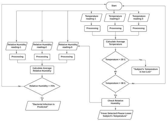 Figure 5. Pressure ulcer prediction algorithm structure. - Prediction of bacterial infection is based on monitoring and preventing the growth of skin bacteria known as Staphylococcus aureus [29]. It is one of the most common bacteria that grows alongside PU scars [30,31]. The system aims to prevent the favorable growth environment of this bacteria. The two main factors in bacterial growth in the skin are temperature and humidity, hence the system continuously monitors these two factors using the (SHT30) Humidity/Temperature sensor at three different locations on the subject’s back to cover the sacral area. Next, the system runs calculations comparing the sensor’s readings against preset thresholds to estimate the risk of developing the infection. Once the risk is detected, an alarm message is sent to the user interface alerting the healthcare givers to take preventive measures, for example, “use cloth to remove sweating and adjust skin temperature”. The threshold for temperature is (>35 °C) and (<39–40 °C), relative humidity between (70–80%). These conditions mark the favorable environment for developing infection in ulcerated skin if they occur together [32]. In this case, time is not accounted for, so when predicted, the healthcare giver is instructed to adjust relative humidity/temperature immediately by drying the skin or ventilating the area, for example. In the case of temperatures dropping below 20 °C, an alarm message will be sent, because it has been shown that lower temperatures leads to low blood flow, which encourages PU formation. Additionally, if temperature is above 38 °C, an alarm indicating that the subject has developed a fever will be shown on the user interface screen. Figure 6 shows a simplified algorithm for bacterial infection prediction.