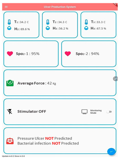 To visualize data and control the system, an application was built using Flutter platform and the Dart programming language. The front screen of the developed application is shown in Figure 7. The application runs extensive operations; it is responsible for receiving and previewing all data sent by the NodeMCU via Wi-Fi, and it also runs the pre-diction algorithms and their feedback. The screen shows data from all sensors; these data are charted into graphs at a rate of 0.2 Hz. Graphs are shown in the results sections.