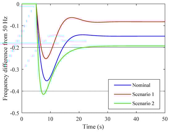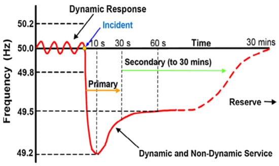 A secure supply of power energy is the main concern in power system operation, i.e., reliable electricity with appropriate quality is supplied to the customers at all times. Thus, it is essential that energy production is continuously balanced with demand: this guarantees that the system’s frequency is maintained within strict limits and centered at nominal value, through load frequency control (LFC) []. In the Great Britain power system, over 30% of the energy produced is based on a renewable energy source (RES), such as wind turbine generators (WTG) []. Over the last half-decade, capacity from the RES has increased by a factor of three, with a corresponding 33% drop in the contribution of fossil fuel, with power stations being closed due to a loss of economic viability or completion of their lifespan. RES is set to remain strategically significant to GB’s power system, with predictions that it will contribute around 50% of energy production by 2025. The rationale for this growth is to achieve reductions in carbon emitted []. The increased use of energy from RESs decreases the system inertia in power systems, and this reduced inertia presents challenges for keeping frequency within a permissible limit. The reduced inertia can also cause major increases in the absolute value of the rate of change of frequency (RoCoF), with the risk that the system may be destabilized when subjected to suddenly occurring disturbances—for example, rising or dropping production or demand. This leads to the need for fast frequency response technologies that can address the challenges that lower inertia presents []. While providing a fast and stable response is required by the control system to the high RoCoF, it should be considered that system oscillation can result from very fast responses. In order to control the frequency in power systems, various control loops are involved: primary, secondary, tertiary and emergency in specified conditions. In the GB power system, the primary loop, which is also recognized as dynamic power generation, reaches the maximum in ten seconds, where the secondary control takes thirty seconds to reach its maximum operative capacity. Frequency response services are classified into dynamic services, which respond automatically to any frequency alternation, and non-dynamic, which are triggered via load frequency relays. When the generation power and the demand is significantly imbalanced, the system will experience major frequency deviations; frequency fluctuation is required by GB-SQSS to remain within an acceptable range, as demonstrated in Table 1 []. Figure 1 shows the actable frequency deviations in the normal operating conditions and when a generation loss of up to 1800MW (representing a substantial nuclear generator) or less suddenly occurs [,].