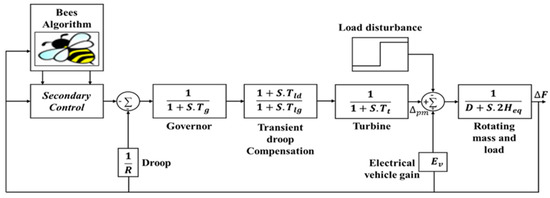 A simplified model of the GB power system shown in Figure 2 was developed using MATLAB Simulink; this model is utilized to analyze the power system frequency and then design an appropriate controller. The characteristics of the generators employed in the system are considered in this simplified model, as well as damping from the loads depending on frequency. Within this, synchronous coal-powered, gas-powered, hydro-power and nuclear plants are responsive to any decline in frequency and increase their generated output power correspondingly. In the model, such synchronous generators are represented by first-order transfer function blocks used to model the governor and the turbine. The governor droop gain R represents the turbine velocity control; this gain is the combined value of all droops of generator speed governors in the system. Tg is the typical time constant of the governor. Stable performance of the speed control is guaranteed by introducing transient droop compensation represented as lead-lag between the governor and turbine. The output mechanical power following the response of the governor which defines the turbine model is characterized in this simulation by the time constant Tt. The system inertia in this simplified model is represented by the time constant Heq, which was considered to represent the current scenario of the GB power system with the high penetration of RERs. The damping obtained from frequency-dependent loads is represented by an equivalent gain value D. The effect of an electrical vehicle (EV) was also considered in this design, which was modeled as an aggregated value represented by a feedback gain in the primary loop, with an estimated aggregated load equal to 2.16 GW. The value of this load was considered to be =1.35 pu (EV load × f/(Network base)), where the network base value is equal to 79.2 GW []; the effect of EV gain on the primary loop response is provided in Appendix A. The secondary control applied in this model is the main study of this paper, which will be examined via different controllers tuned by proposed algorithms including the Bees Algorithm, which represents the main contribution of this work. The parameters applied in this simplified model are tabulated in Table 2 [,,]. It should be noted that the model used in this study to examine the frequency response of the GB power system is simplified; accordingly, the small effect of nonlinearities such as governor dead band (GDB) and generation rate constrain (GRC) is neglected.