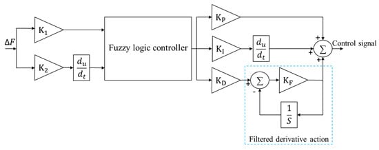 There has been a broad implementation of fuzzy PID controllers in different structures to solve the LFC problem and a significant enhancement in performance has been achieved, as reported in the literature. It is also proven that in order to gain further enhancement in the overall system performance and improve the stability, a simple filter for the derivative mode of the fuzzy PID controller can be applied [,]. Moreover, the performance of these controllers mainly relies on the selection of the scaling factor gains of the input and output of the controller, but it is difficult to find the optimum values of these gains using the trial-and-error technique. In view of the above, a fuzzy PID controller with derivative filter (Fuzzy PIDF), in which the scaling factor gains are tuned by the Bees Algorithm, is proposed in this section for LFC. The structural design of this controller is illustrated in Figure 3. As is clear from the figure, the controller has two inputs, ∆F and the derivative of ∆F and one output; in the case of employing this controller in a multi-area power system, the two inputs are the Area Control Error (ACE) and the derivative of (ACE).