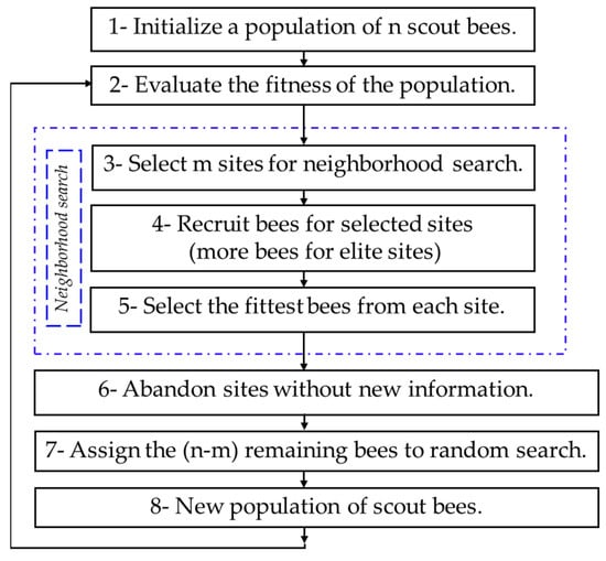 As with any optimization algorithm, a number of parameters are required to be set—specifically, the number of scout bees (n), number of selected sites for search out of n visited patches (m), number of best (elite) sites among them selected sites (e), number of recruited bees in the best-selected e sites (nep), number of bees sent to the other (m-e) selected sites (nsp), the initial size of each patch (ngh), which includes the site and the neighborhood, area as well as the stopping criteria. The mechanism of this algorithm begins with placing the n scout bees randomly in the search space. In step 2, the evaluation of the fitness of sites visited by the n scout bees is done. The m sites with the highest fitness in specified “chosen sites” in step 3 are selected for neighborhood or local search. The algorithm in steps 4 and 5 conducts searches in the neighborhood of the selected sites, with more bees assigned to the best e sites. Selection of the best sites could be conducted directly based on the fitness associated with them. Alternatively, using the fitness values, the probability of sites being selected is determined. Searches in the neighborhood of the best e sites which represent the most promising solutions are made more prominent by recruiting more bees for them than for the other selected sites. Together with scouting, this differential recruitment is a key operation of the Bees Algorithm. For each patch, only the one bee that has found the site with the highest fitness (the “fittest” bee) is selected in step 5 to form part of the next bee population. In steps 6–8, the remaining bees in the population n are assigned randomly around the search space to scout for potential new solutions or to conduct the global search. These eight steps are repeated until a stopping criterion is met. The colony will have two parts to its new population at the end of each iteration: representatives from each selected patch and other scout bees assigned to conduct random searches [].