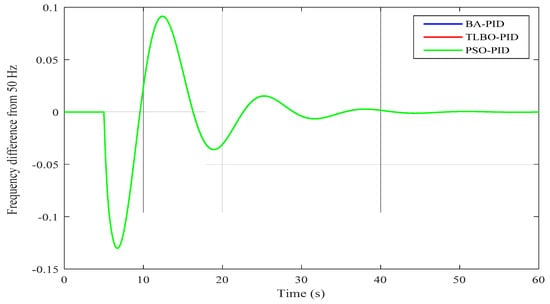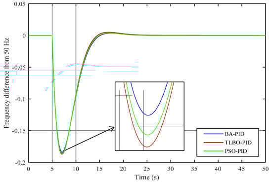 From Figure 6 and Table 7, it is clear that when the PID is tuned using the proposed algorithms based on ISE, almost identical responses are obtained. On the other hand, when ITAE is used as an objective function to design the PID controller, as demonstrated in Figure 7 and Table 8, BA shows better performance in terms of undershoot and overshoot, with only a 0.1840 Hz drop in frequency.