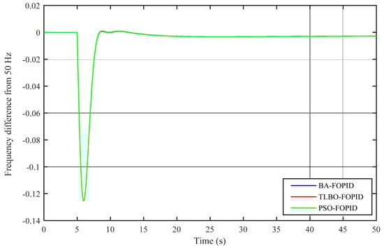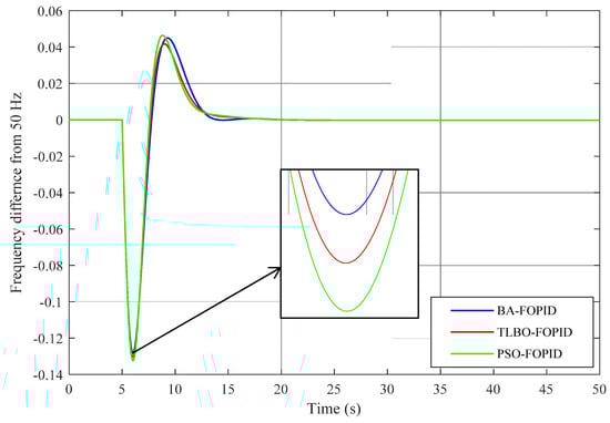 Results obtained based on the proposed algorithms “BA” tuning PID and FOPID are compared with those of TLBO and PSO; it is found to be a successful solution and provides excellent performance in many aspects, i.e., undershoot, overshoot and settling time, which are shown in Table 7, Table 8, Table 9 and Table 10. The changes in the frequency of the GB power system when different conventional controllers tuned by different optimization algorithms are used to control the frequency deviation are shown in Figure 6, Figure 7, Figure 8 and Figure 9.