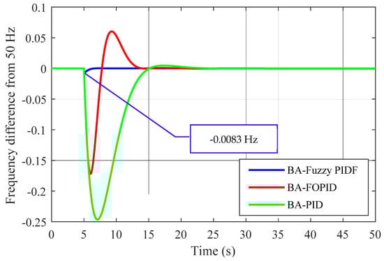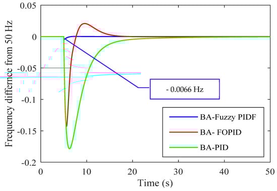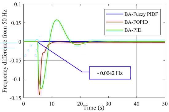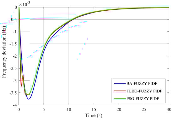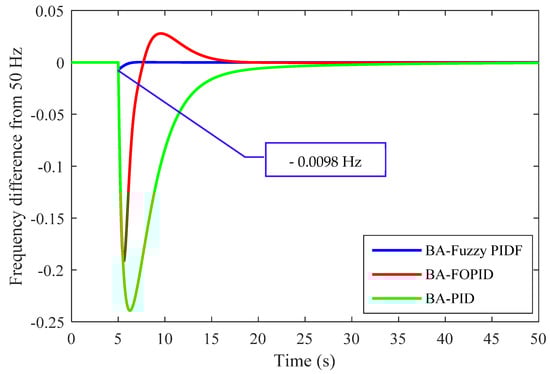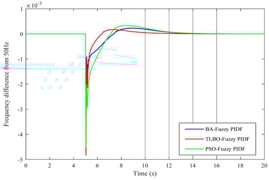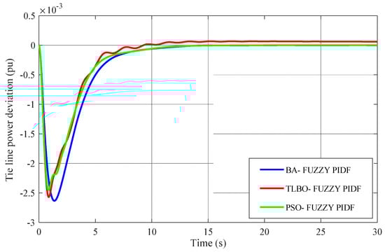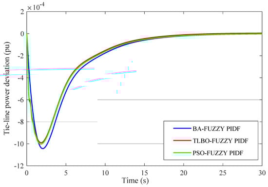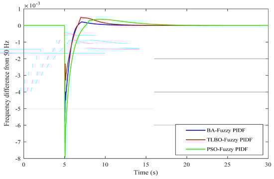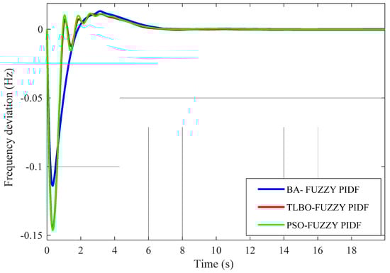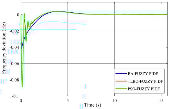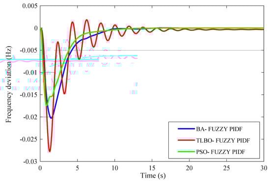 From Figure 18, Figure 19 and Figure 20 and Table 20, it is observed that the proposed Fuzzy PIDF controller provides an excellent dynamic response in different aspects. Moreover, despite the small difference in results obtained by applying the proposed controller based on the suggested optimization techniques, it is obvious that the Fuzzy PIDF tuned by BA offers the best response among the investigated techniques in terms of peak undershoot experienced in the area 1, with only −0.04 Hz recorded after applying the sudden disturbance, while the smallest drop in the frequency of area 2 was −0.0036 Hz based on the TLBO- and PSO-tuned Fuzzy PIDF.