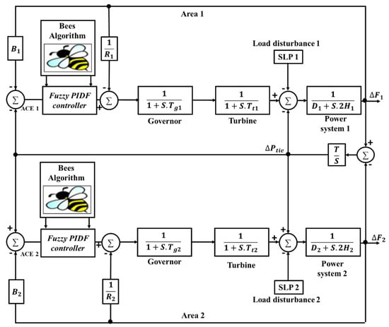 This study is extended to a multi-area interconnected power system as demonstrated in Figure 17. This model is extensively investigated in the literature to study the dynamic behavior of different control concepts for LFC in power systems [,]. It consists of two unequal thermal interconnected areas; the parameters of this model are tabulated in Appendix C. Based on the function of the LFC loop in multi-area power systems, the main tasks of LFC are providing the required power from the generation units to meet the load variation and maintaining the interchanged power among interconnected control areas via tie-lines at pre-rated values. The specified objectives of LFC that contribute to improving the overall power system stability are to guarantee zero steady-state errors in frequency fluctuations of different control areas along with the tie-line power fluctuations. It is also responsible for reducing the overshoot and undershoot of the oscillation within a specified time; this depends on the size of the disturbance and the capacity of the power system.