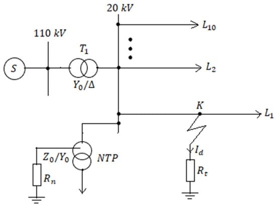 Simplified diagram of the medium voltage electrical network with the neutral connected to ground through the resistor (resistor grounded neutral networks).