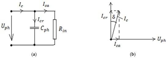 In insulating materials, including the insulation of medium voltage electrical networks, located in an electric field, active power losses occur. For this reason, the electrical scheme equivalent to a real capacitor consists of an ideal capacitor connected in parallel with an ideal resistor (Figure 2a) []. This scheme is also valid for the electrical capacity between the phase conductors of the medium voltage power line and ground. From the phasor diagram shown in Figure 2b it can be seen that the phase shift angle between the capacitive current () and the voltage is (90°−δ). The angle δ represents the loss angle of the dielectric material []. The insulation state of the 20 kV network is characterized by the tangent of the loss angle (δ). If the insulation is perfect, then the tangent of the loss angle is equal to zero, and the zero-sequence impedance of the 20 kV network is purely capacitive. If the insulation of the medium voltage network deteriorates, then the tangent of the loss angle increases. In this paper, the maximum value of the tangent of the loss angle of 0.105 was considered. In the case of 20 kV cable power lines, the active component of the capacitive current is higher than that of overhead power lines. The total capacitive current of the 20 kV network, shown in Figure 1, is 102.5 A. This value was determined experimentally.