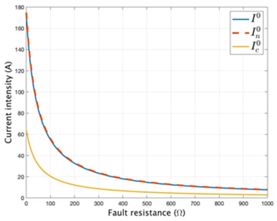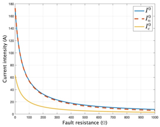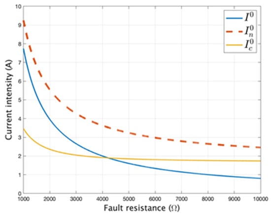 For the analysis of the dependence of the effective values of the currents as functions of fault resistence, it is considered that the value of this parameter ranges from 0 to 10,000 ohms, while the effective value of the zero-sequence voltage () is either 0, 575 V, or −575 V are and the tangent of the insulation loss angle (tanδ) 0.105 and 0, respectively.