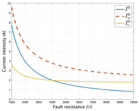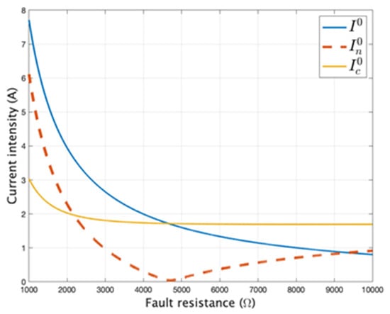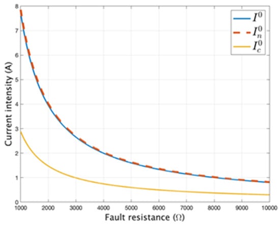 Current as functions of fault resistance ∈ [1000, 10,000 Ω], tanδ = 0 (δ = 0), .