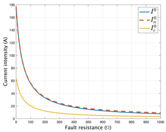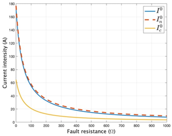Current as functions of fault resistance ∈ [0, 1000 Ω], tanδ = 0 (δ = 0), .