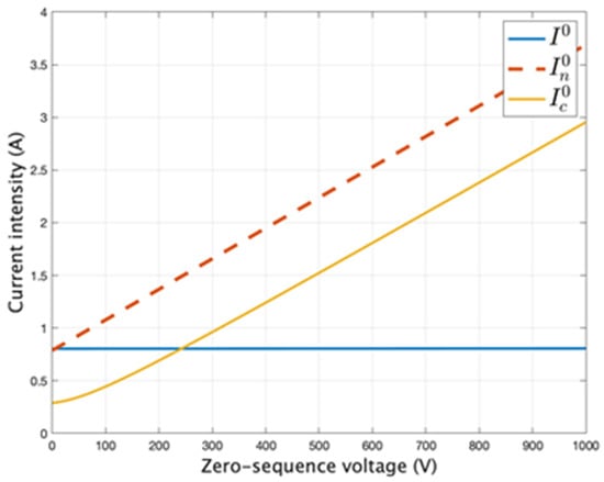 The zero-sequence capacitive current ( of the medium voltage network is obtained by applying Kirchhoff’s first theorem in the diagram in Figure 5: