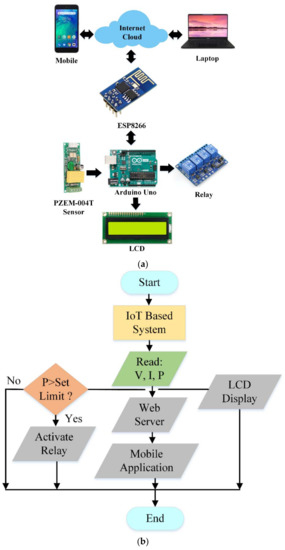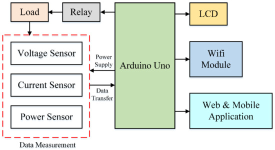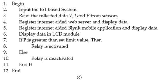 Cost effectiveness and easy installation are essential features to make any model competitive in the global market for home applications. In this paper, a schematic overview of the proposed low cost ISHDB system as shown in Figure 1a is proposed to hold such features [35,36,37]. The system consists of two core modules, namely a) a hardware interface module and b) a software communication module. An Arduino Uno microcontroller is settled at the heart of the system to interface an IoT website and the hardware module. All of the communication and controls of this system are passing over the microcontroller. The IoT based system records various data including voltage (V), current (I), and power (P) from the definite segments. These data can be displayed on a liquid crystal display (LCD) screen, web server, and mobile application. The data restrained by the sensors are explored in the control system which perceives the consumption of the household loads and disconnects any load once the set limit current or power has been surpassed. The entire flowchart of the proposed system is revealed in Figure 1b. In the first step, the proposed IoT-based system receives the V, I, and P data from the measuring sensors. These data can be visualized through LCD display, web server, and mobile application. The calculated power is compared with a predefined value based on the rating of the monitored device. If the measured power exceeds the set limit, the associated relay is activated to disconnect this device; otherwise, the normal operating condition is maintained. The pseudocode of the proposed method is detailed in Figure 1c to understand the implementation of the intended model.
