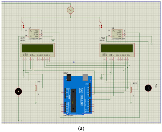 The structure of the proposed ISHDB system is firstly developed using Proteus Professional Design Suite software, as shown in Figure 2a. The proposed model consists of AC power supply, Arduino Uno, sensors, two LCD screens, switches, and two different loads. The switches are assumed to mimic the operation of circuit breakers in real applications. The components are linked functionally so that they can operate according to the users’ commands. Before developing the hardware prototype and to avoid circuit complexity, the intended model is simulated further using Fritzing software. To get a better realization about the hardware connection configuration, the electronic elements are assembled using a breadboard as shown in Figure 2b.