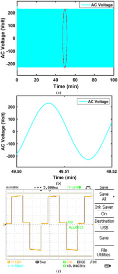 The results for the 1000-W iron and 800-W toaster are shown in Figure 6d,e, respectively. In both cases, the power was automatically turned off for the last 10 s. For the tested iron, the power changed within the range 932 W to 915 W during the first 100 s. In contrast, the toaster took nearly 1 min and 50 s to toast two slices of bread with a power changing in the range 706.2 W and 698.6 W. The decreased reading may be attributed to an error within the appliance. The simulated AC voltage density is shown in Figure 7a while Figure 7b depicts the pure AC voltage signal. Nevertheless, for the low powered applications such as mobile phone or laptop charger and a small fan, the experimental result of the modified AC sine wave is as shown in Figure 7c.