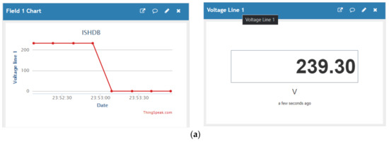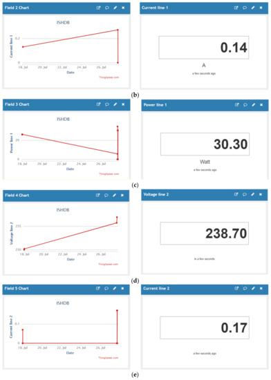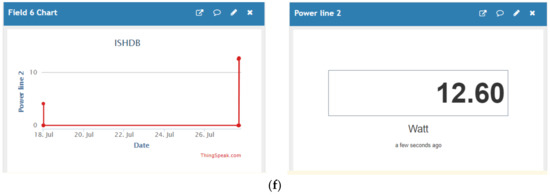 In the ThingSpeak-based web system, six field data have been proposed in the ThingSpeak channel. This includes: voltage line1 (field 1), current line 1 (field 2), power line 1 (field 3), voltage line 2 (field 4), current line 2 (field 5), and power line 2 (field 6). The channel status as shown in the web server was collected as revealed in Figure 8 and stored in the cloud. The channel was updated every minute to display each of the above six fields graphically and numerically as shown in Figure 8a–f. Additionally, in order to facilitate a user-friendly interface, a Blynk application has been developed. In this regard, Blynk project (ISHDB) accompanied by data screening (LCD) was created as shown in Figure 9a. Data of two fields (lines 1 and 2) are displayed in Figure 9b. These results demonstrate the effectiveness of the proposed method which is easy to implement for existing household systems. The proposed system was compared with other existing methods as shown in Table 2 to reveal the effectiveness of the developed ISHDB model. Compared to the several number of research papers on the IoT aided smart home applications, the proposed model in this paper shows superiority in terms of lowest cost and time-span.