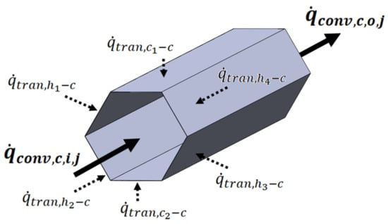 where AHT is the total heat transfer area shared with one neighbor, U is the overall heat transfer coefficient, and the temperature difference between the example cold channel and a transverse neighbor k is Ttran,k − Tc,i,j. While two of the transverse channel neighbors are cold channels, the potential for similar fluid heat transfer means the temperature difference is evaluated the same as the hot channels and is summed into a single term. The m in the denominator is the number of discretized steps of the heat exchanger core length. The expanded channels have a rough hexagon shape, which means there are four heat flux terms from neighboring hot channels, and two heat flux terms from neighboring cold channels. Similar fluid heat transfer between cold channels could be in either direction depending on their temperature, and is generally lower in value than the heat transfer with neighboring hot channels.