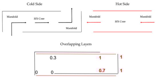 A number of papers discussed flow maldistribution due to the manifold [48,49,50,51]. Different paths of the fluid in the manifold (see Figure 1) have different flow resistances, so channels have varying flow rates in the HX core. The problem of manifold heat transfer not being the same for all fluid paths has not been analyzed [52]. The present paper addresses this analysis by varying the boundary conditions at the HX core based on different manifold heat transfer characteristics to examine the effect on each fluid path in the core. With improvement to the model using the conclusions of the analysis, better fit between the modeled and experimental results can be achieved and design of microchannel heat exchangers can be improved by taking into account manifold heat transfer with maldistribution.