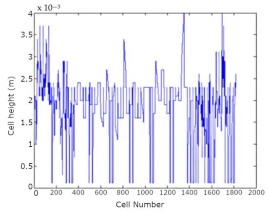 The measured height of the core of the prototype is shown in Figure 6, split into discretized cells (CT scan data were not available for the manifold). There are 26 cells for each channel in the prototype, and there are 70 channels. The data are organized such that the first 26 cells represent the channel in Cold Row 1–Cold Column 1 (see also Figure 3), the next 26 represent Cold Row 1–Cold Column 2, to the end of Cold Row 1. Then the next channel is Hot Row 1–Hot Column 1, to the end of Hot Row 1 and so on. Starting from Cold Row 1–Column 1, the first cold row ends at cell number 182, which can be seen on Figure 6 as the first sharp decrease in cell height because of the pinched sides on the layer. The next layer starting with Hot Row 1–Hot Column 1 goes from cell 183 to 365, and each layer following in increments of 182 cells. Note the lowest cell height is 0.115 mm which is the pinch height (minimum height required for modeling, see [32]). From these data, the change is more rapid at the top and bottom of the HX (left and right of the figure).