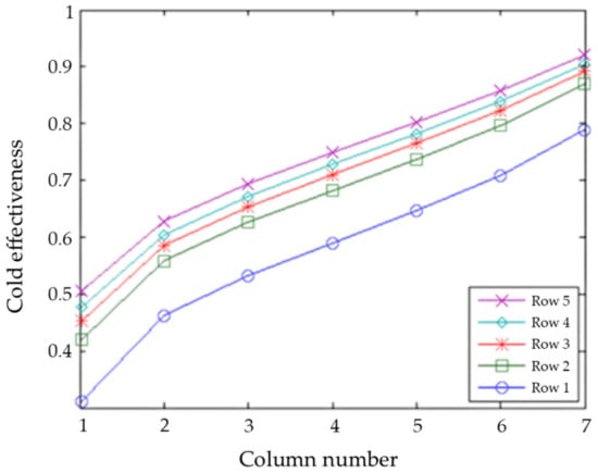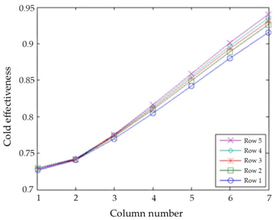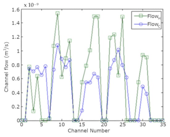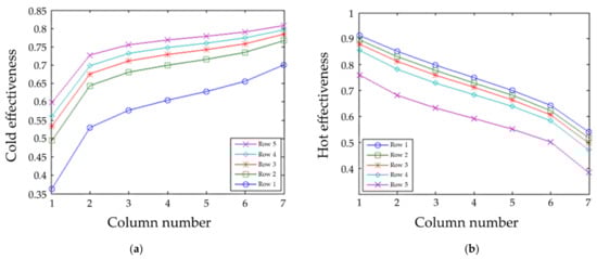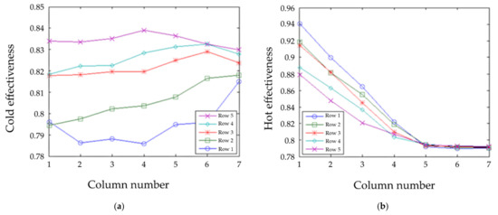The flow predicted by the advanced model in the actual HX based on channel heights in the core is shown in Figure 7, which shows the positive correlation between the hot and cold flows. The irregularity parameter, ε, characterizes the channel flow maldistribution with 1 being no maldistribution [52]. At high NTU, the effectiveness approaches the irregularity parameter. Based on the channel height geometry, the cold ε = 0.591, and the hot ε = 0.540. The sixth and seventh column channels are nearly all pinched off for both cold and hot flow. There is also less flow in the first column than in the center columns. This makes sense because gluing the layers on the sides of the HX pinched the side columns together.