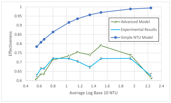 The 10 experimental trials were simulated in the advanced model. The averaged results of the advanced model are compared with the experimental data in Figure 8. The overall root mean square (RMS) effectiveness error of 3.8% is larger than expected with the effectiveness expected experimental error of 0.7% and the flow rate experimental error of 1–2% (small effectiveness impact).