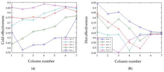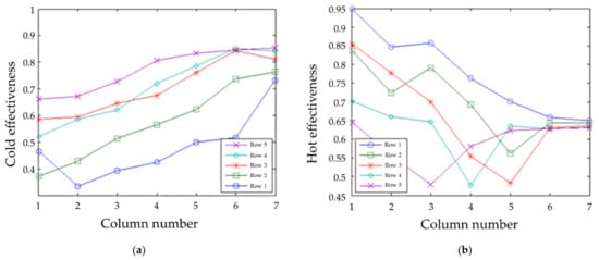 Effectiveness with asymmetric boundary temperatures and NTU = 5. (a) Cold side; (b) hot Side.