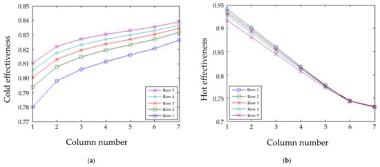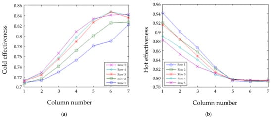 Effectiveness with symmetric temperature boundary conditions and NTU = 5. (a) Cold side; (b) hot side.