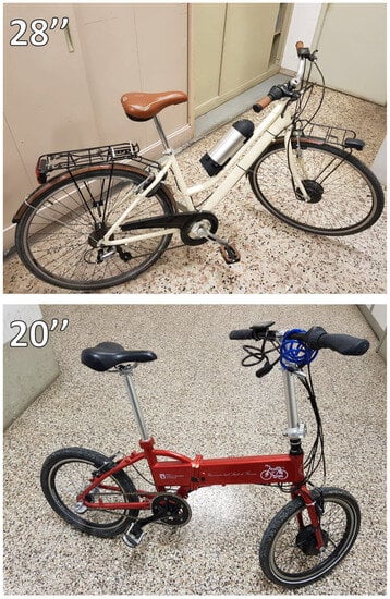 The six volunteers first performed closed-circuit tests. Closed-circuit tests are designed to simulate typical standing start and braking conditions, such as stops and restarts in correspondence to traffic lights, prescription signs (e.g., ‘STOP’ sign) or roundabouts. The aim is to develop reliable models that, on the basis of a series of parameters related to the characteristics of the rider and the vehicle, can provide information on the vehicle’s motion at different times for the specific event. For the monitoring of accelerations, speeds and travelled spaces, to be subsequently approximated by models, a smartphone equipped with accelerometers was employed. The tests were performed using two diverse types of e-bike with an equal number of assistance levels (five), but different in terms of wheel diameter (20 versus 28) and number of gears (three versus six). Assistance of the motor was, in both bikes, controlled by the movement of the wheel and not by the torque on the pedals and was supplied with a different intensity for each selected assistance level, up to a maximum speed of 25 km/h. This provides the basis with which one can derive results that are applicable to a broad range of e-bikes on the market. In fact, while no in-depth information is available in terms of the market penetration rate for these types of city bikes, wheels with a 28 diameter typically suit a bike frame for a person whose height ranges between 165 cm and 178 cm (https://www.feltracing.com/26-inch-bike-for-what-size-person/, 13 October 2021); since these lower and upper bounds correspond to the average heights for European women and men, respectively, it can be derived that these city bikes are extremely popular in Europe. The 20 diameter conversely corresponds to the typical wheel size of a folding bike, a compromise between compactness of the folded configuration and bike agility in the road environment [33]. The two e-bikes used for experimentation can be seen in Figure 1. The tests were carried out using e-bikes as they are exhaustive with respect to the case of e-scooters [7]: they do not require pedalling, and in these latter vehicles, the contribution related to the physical abilities of the user is missing; their gender becomes, for example, a less-relevant factor in the performance of the vehicle-rider assembly. In addition, e-bikes are characterized by methods of shifting/transmission of motion which can significantly affect their performance (as already noted, wheel size and selected gear). For this reason, it is unnecessary to investigate the behaviour of e-scooter riders in detail: referring to a generic e-scooter (refer to Section 3 for an example), it was measured that a speed value from 0 to 25 km/h was reached in about 40 m with the maximum assistance level (constant acceleration close to 0.6 m/s2).