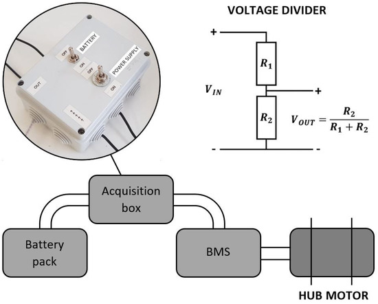 The power absorbed by the battery, , can be estimated by measuring the voltage, V, and current, I, outputted by the battery pack ( = V·I) at the charging port. Figure 4 represents a scheme of the measurement apparatus required to monitor these quantities; specifically, the ‘acquisition box’ element must consist of a current meter and a voltage divider. The latter is required since tools such as data acquisition cards do not typically exceed 10 V of range; based on the maximum voltage associated with the batteries that is expected to be measured (usually tens of volts), and resistors can be selected to read a output voltage compatible with the range of the card. The current meter can be employed as-is, without further modification.