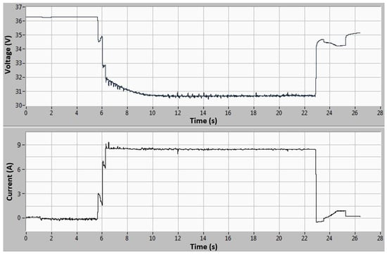 As an example, the acquisition box shown in Figure 4 was specially developed; the current meter is fed by an external power supply connected to the lower cables (‘POWER SUPPLY’). The current meter is a 50 A HAIS 50 LEM (powered by an external 12 V and 1.2 Ah battery), while the voltage divider is composed of and resistors of 2 k and 10 k, respectively. This apparatus allows for the measuring in output (side cable ‘OUT’) the evolution of voltage and current over time provided by the battery (connected to the upper cables—‘BATTERY’); because of the decrease in voltage (switching from to ) required to enable the reading process through an NI DAQ card (range 0 ÷ 10 V), the acquired voltage must then be multiplied by the reduction factor used to obtain the actual voltage value. Figure 5 illustrates an example of voltage and current evolution for a moving e-bike, monitored by the acquisition box in Figure 4.