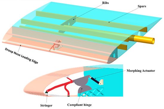 One of the EU-funded Clean Sky 2 projects on Natural Laminar Wings were focused on the conceptual design of a morphing leading edge capable of satisfying high-lift requirements [47]. In this project, researchers worked on the skin structure, the internal compliant structure, and a possible actuation mechanism. A morphing leading edge was presented as a flexible alternative to rigid and permanent ribs having a high degree of stiffness. The flexible skin plates were made by merging numerous plates with revolute joints molded to the airfoil section’s shape. The skin was allowed to move relative to the skin joint by using sliding joints and stringers to maintain rigidity.