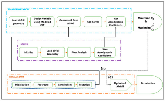 Several nature-inspired algorithms by biological systems, including particle swarm optimization (PSO), bee colony optimization (BCO), ant colony optimization (ACO), and genetic algorithm (GA) have been used for airfoil optimization [57,58,59]. Each of these methods optimizes globally. Recent work has proposed the use of Black Widow Optimization (BWO) to solve numerical optimization problems [60]. This algorithm was inspired by the black widow spider’s life cycle. The black widow spider is well known for its unusual mating behavior, which served as the inspiration for the algorithm utilized in this study; consider it a combination of evolutionary and swarm techniques. The BWO includes a phase that is unique, called “cannibalism”. This phase has the advantage of excluding species with inadequate fitness from the circle, ensuing in algorithms converging faster. When compared to the other studied algorithms, the suggested BWO algorithm is capable of avoiding local optima. This algorithm makes no use of additional information, such as the objective function’s gradient values.