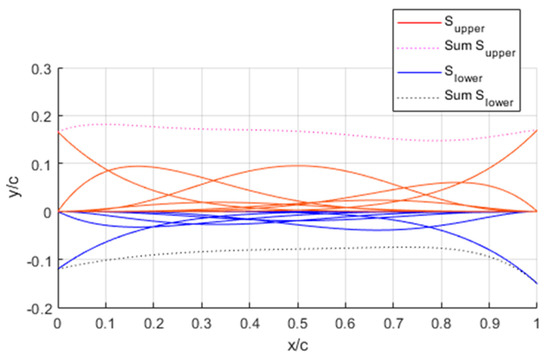 The shape functions produce the specific shapes of the airfoil. The function is composed of various weights and defined as a real value, and is dependent of i, inside a Bernstein polynomial [55]. The equations for the upper and lower surfaces differ;