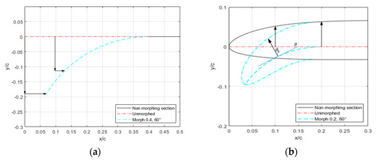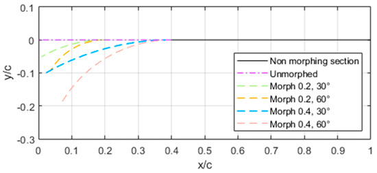 There is also a need to constrain the droop-nose leading-edge morphing. Therefore, new parameters are added to impose where the deflection of the LE on the wing begins, as well as to impose a specific deflection angle (θ). The approach taken assumes that there is an axis located on the axis that serves as a basis for the morphing. An arc that is a tangent to the axis on one side and tangent to the deflection angle on the other side begins at . The length of the arc is that of . The skin keeps its relative position to the closest point on the morphing mechanism, meaning that it keeps the same distance that is perpendicular to the mechanism’s arc. Figure 6 illustrates the setup by showing the axis and arc’s neutral unmorphed position and then its variation of with while morphing occurs. For example, the Morph 0.2, 30° figure’s morphing begins at , and the tangent of the end of the arc that is not on = 0 has a 30° angle to the axis.
