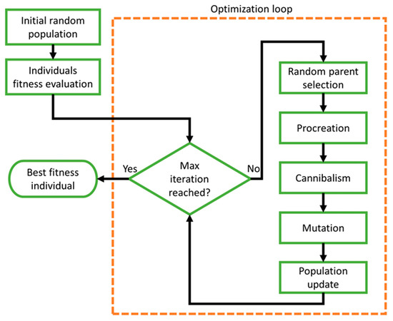 where the parents are denoted by and and the offspring by and . The process is reiterated times. The fitness value is stored by adding the parents and offspring. A cannibalism rating (CR) according to which the number of survivors is determined is set. Based on the CR, some of the best individuals are added to the newly created population.