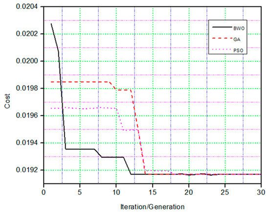 Cost convergence comparison of the BWO, PSO, and GA.