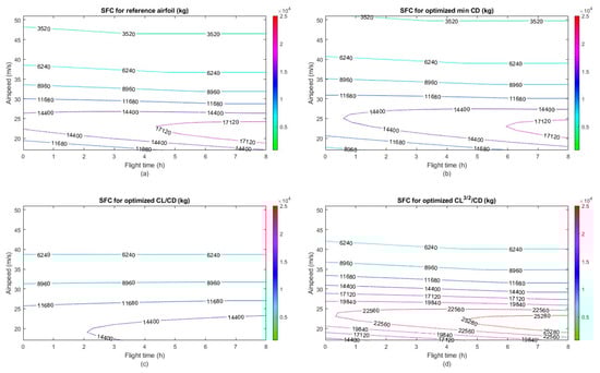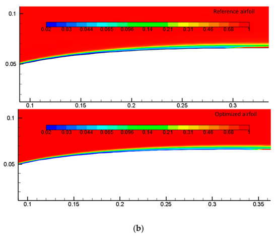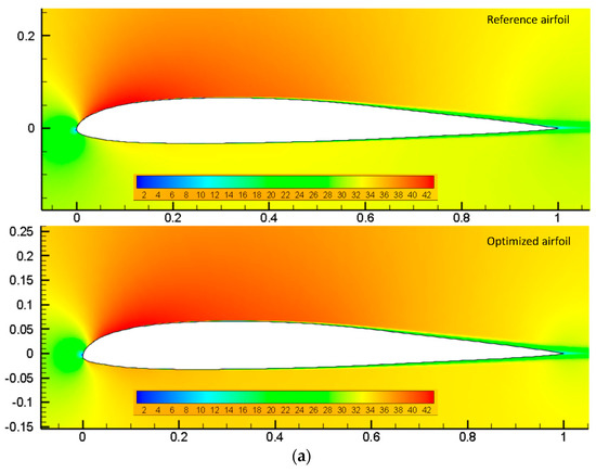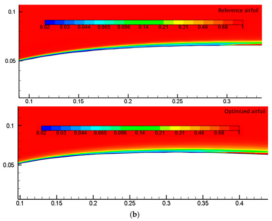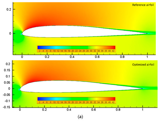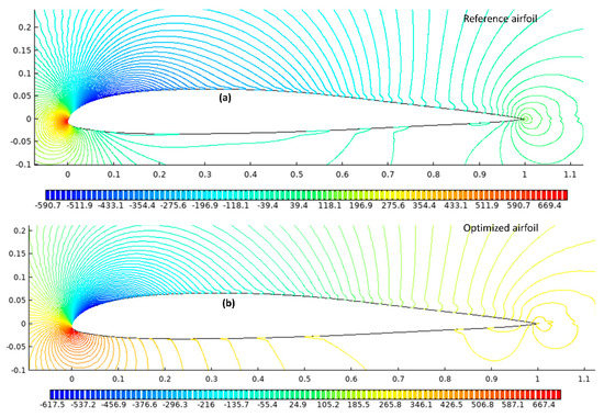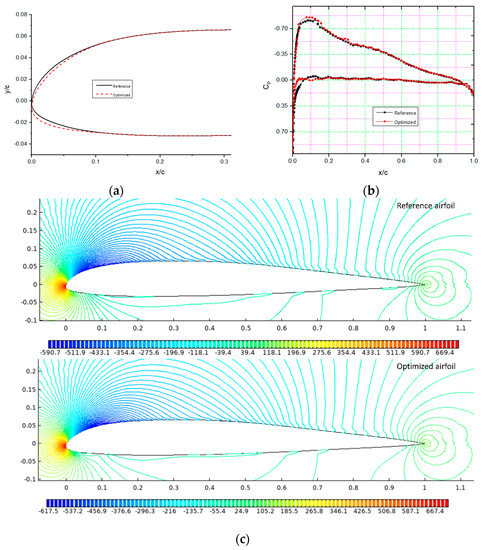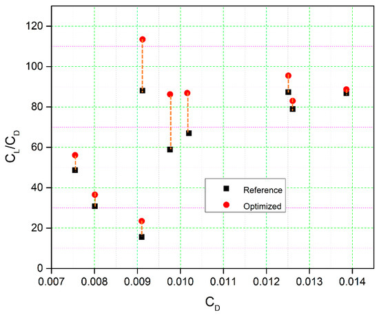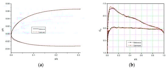 The cruise flight condition was chosen because most of the flight time and fuel consumption occurs during the cruise phase. Accordingly, the objective functions were selected to maximize the aerodynamic endurance and to minimize the drag. The maximum lift coefficient and the lift coefficient of the reference airfoil at each angle of attack were implemented as constraints. Penalty functions applied constraints to the objective function to ensure that the optimum performance was obtained at each given angle of attack. The free-stream Mach number was 0.1, and the Reynolds number was 2.4 × 106. The general optimization problem is presented as follows: