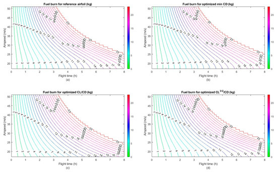For the design of a long endurance UAV, the aerodynamic endurance (E) of a propeller-powered UAV, as established by using the Breguet formula [63], is used as an objective function: