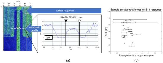 Feature measurement: (a) Graph showing the x-profile of an antenna along the dashed line of the profilometer image, with black and white triangular indicators marking the point of 3 μm height (skin depth) on either side of the microstrip. measures the space between the markers and is taken as the microstrip width: 321 μm for this cross-section; (b) Plot showing average surface roughness compared with respective antenna S11 response at 8 GHz. Surface roughness was measured as Sq, or root mean square height, on the antenna patch using the same profilometry software as in (a). We expect no change to the trends calculated in this work if we instead used arithmetical mean roughness Ra. Results in (b) show no noticeable correlation between roughness and S11 in this dataset.