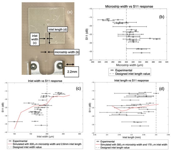 To assess the individual contributions of changing inlet width and inlet length on antenna performance, a set of simulations were performed holding all other dimensions constant at their designed values, while allowing the inlet dimension of interest to vary along one standard deviation of the experimentally measured range. For inlet width assessment, the microstrip width was held at 300 μm, the inlet length held at 2.6 mm, and the inlet width swept from 100 μm to 260 μm. For inlet length, the microstrip width was held at 300 μm, the inlet width held at 200 μm, and the length swept across 2.42 mm to 2.6 mm. In each case, the simulated data was plotted and overlayed with the experimental data in Figure 2c,d. The poor fit of the simulation data to the experimental results illustrates that are not solely responsible for S11 performance are also not solely responsible for S11 performance variations.