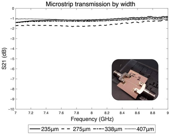 A set of microstrip lines 18 mm in length and spanning widths of 235m to 407m, were printed to determine the effects of variation on overall transmission line performance. From Equation (1) this variation translates to characteristic impedances ranging from 60 Ω to 40 Ω respectively. S21, or transmission, was measured from 7 to 9 GHz between two 50 Ω ports for each printed microstrip. All transmission lines displayed S21 values of >−2 dB at 8 GHz (Figure 3). This result suggests that this level of variation in printed microstrip width has no significant, independent effect on antenna S11 values.